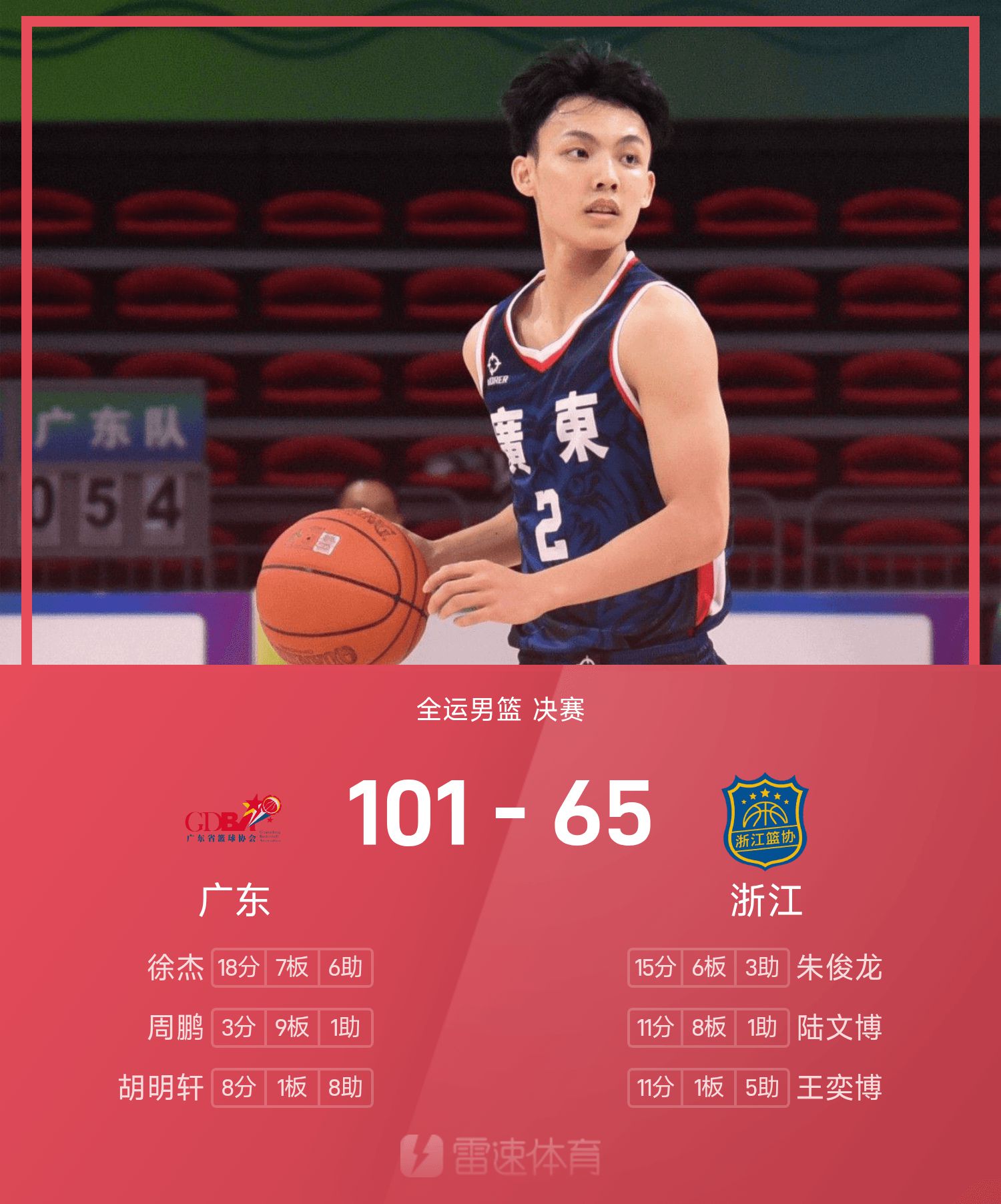 บาสเกตบอลชายรอบชิงชนะเลิศกีฬาแห่งชาติ ซูเจี๋ยทำ 18 แต้ม 7 รีบาวด์ 6 แอสซิสต์ กวางตุ้งเอาชนะเจ้อเจียง 101-65 คว้าเหรียญทอง