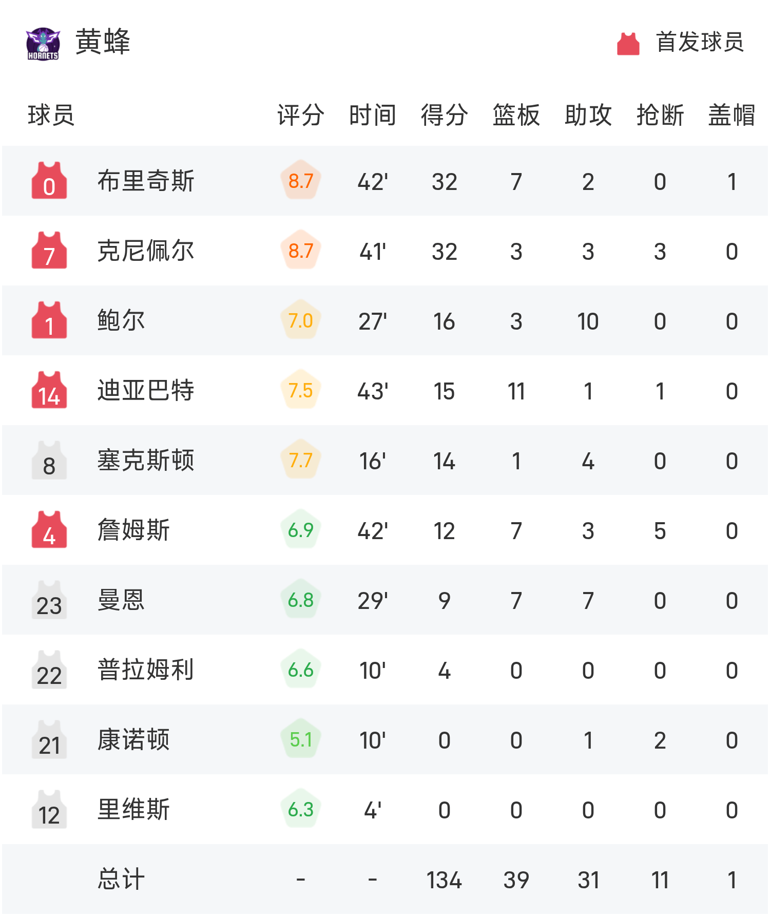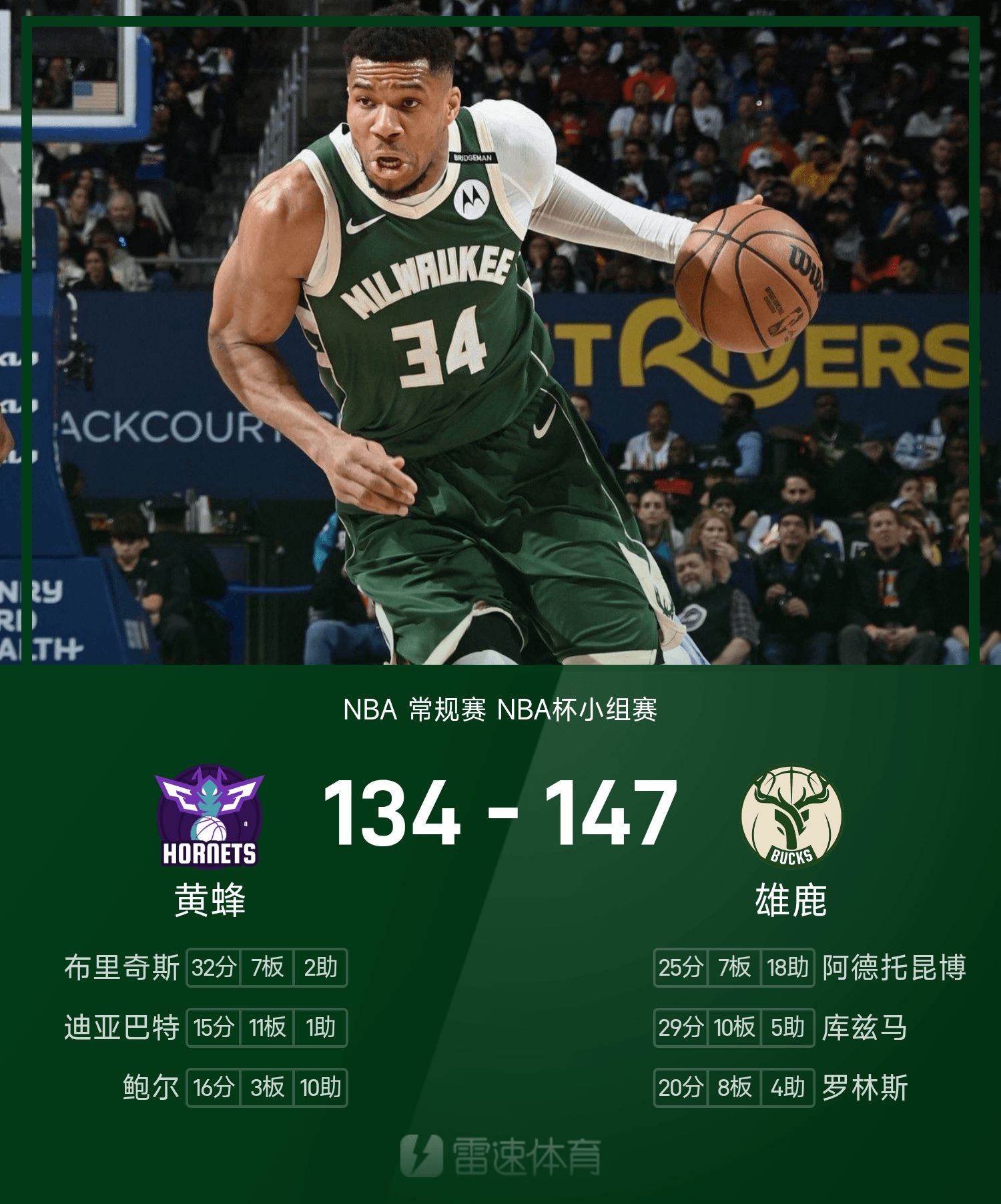 6686 กีฬา ข่าว 15 พฤศจิกายน ในการแข่งขันรอบแบ่งกลุ่ม NBA Cup ประจำฤดูกาล 25/26 ของ NBA Bucks เผชิญหน้ากับ Hornets จบเกม บัคส์ เอาชนะ ฮอร์เน็ตส์ 147-134 คุซม่าทำ 29 แต้ม 10 รีบาวด์ 5 แอสซิสต์ นำทีมคว้าชัย บริดเจสทำคะแนนสูงสุดในเกม 32 แต้ม 7 รีบาวด์ และ 2 แอสซิสต์