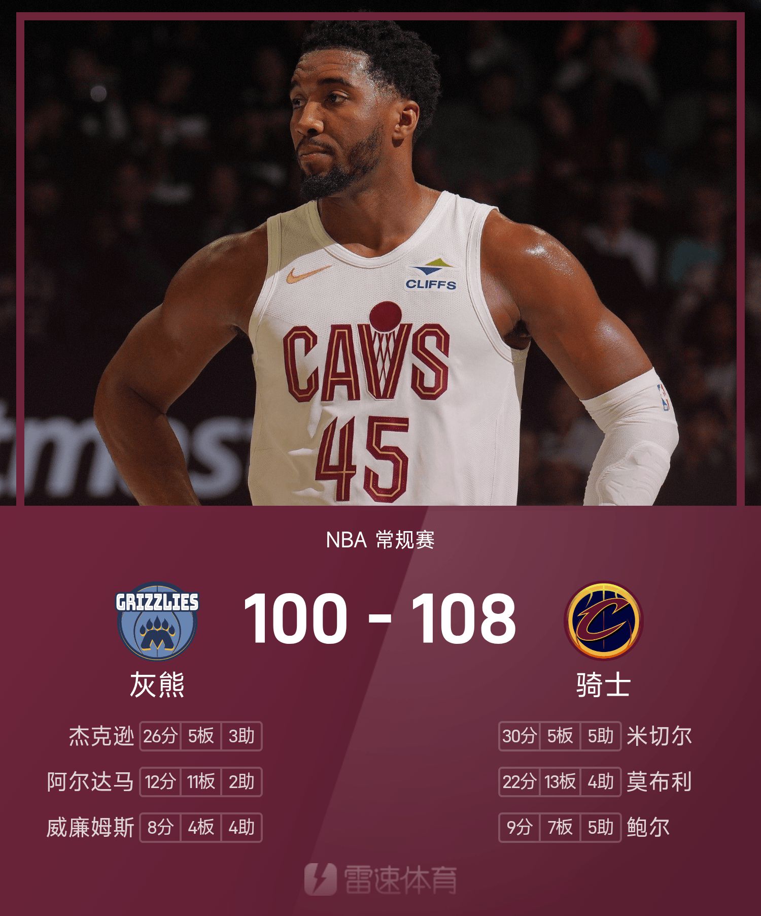 รายงานการดวล NBA: มิทเชล 30+5+5 คาวาเลียร์ส พลิกกลับ กริซลี่ส์ 108-100