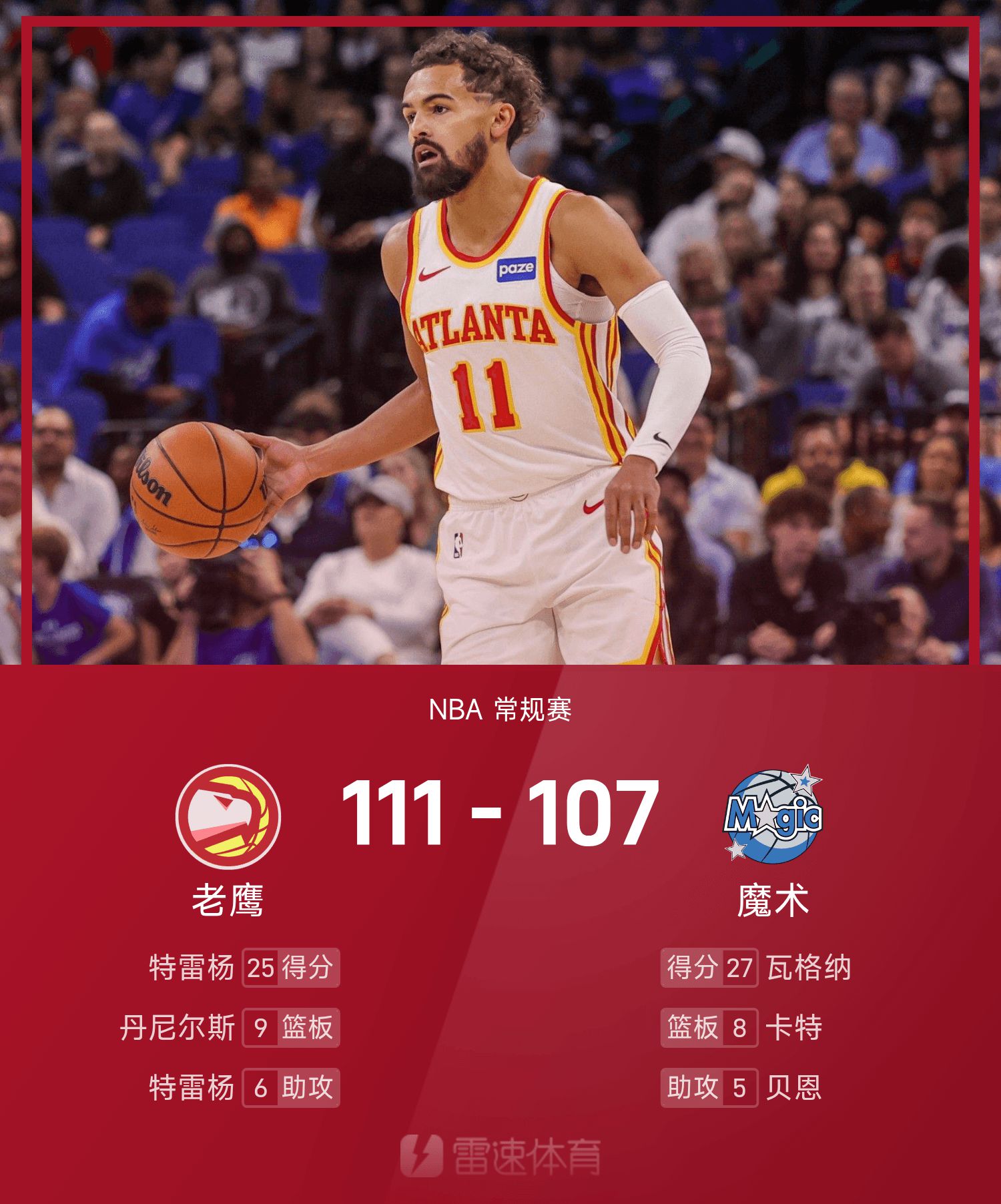 รายงาน NBA เทร ยัง มี 25 แต้ม 6 แอสซิสต์ ฮอว์กส์ เอาชนะ เมจิก 111-107 อย่างหวุดหวิด