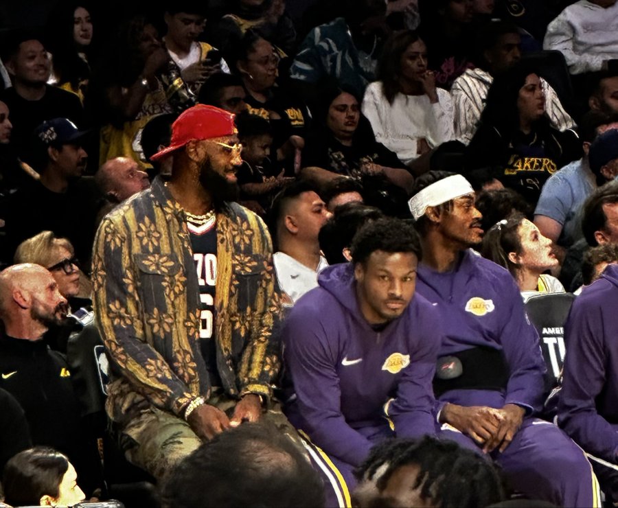 นักข่าวของ Lakers แบ่งปันรูปภาพของสถานที่เกิดเหตุ เลอบรอนปรากฏตัวข้างสนามโดยสวมชุดเครื่องแบบของมหาวิทยาลัยรัฐแอริโซนา ไบรซ์ ลูกชายคนเล็กของเขาเพื่อดูเกม โดยมีบรอนนี ลูกชายคนโตนั่งอยู่ข้างๆ