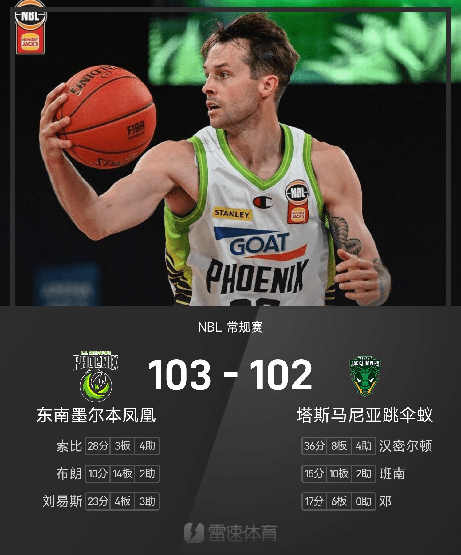 รายงานศึก NBL โซบี 28 แต้ม เมลเบิร์น ฟีนิกซ์ ตะวันออกเฉียงใต้ เอาชนะ แทสเมเนียน ดิ่งพสุธา มดส์ 103-102