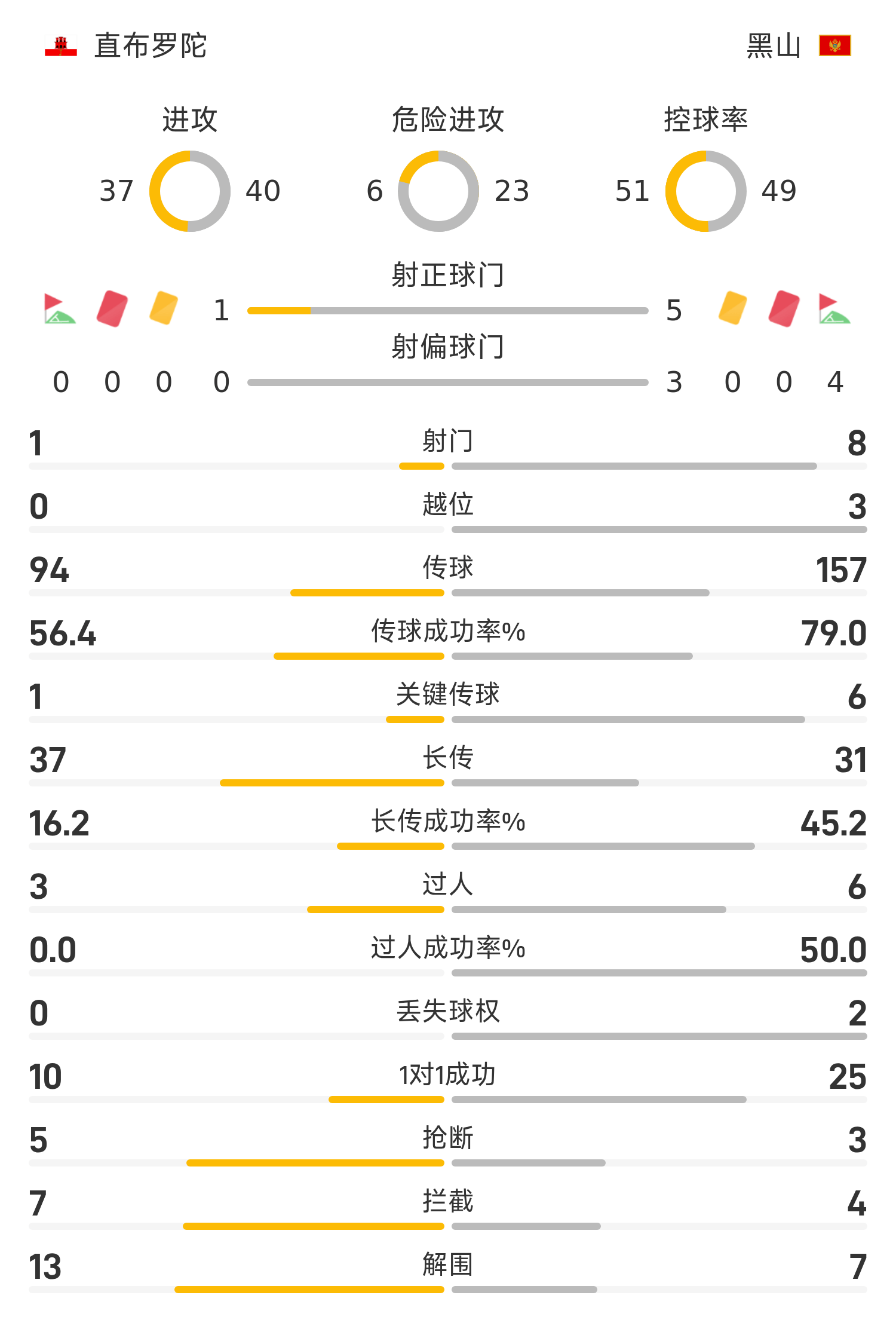 รายชื่อผู้เล่นตัวจริงของยิบรอลตาร์: 23-Hankins, 3-Jolly, 6-Lopez, 5-Ainsley, 14-Ronan, 2-Mauro, 22-Torilla, 19-Jessop, 4-Pozzo, 8-Scane Len, 12-เบิร์ก