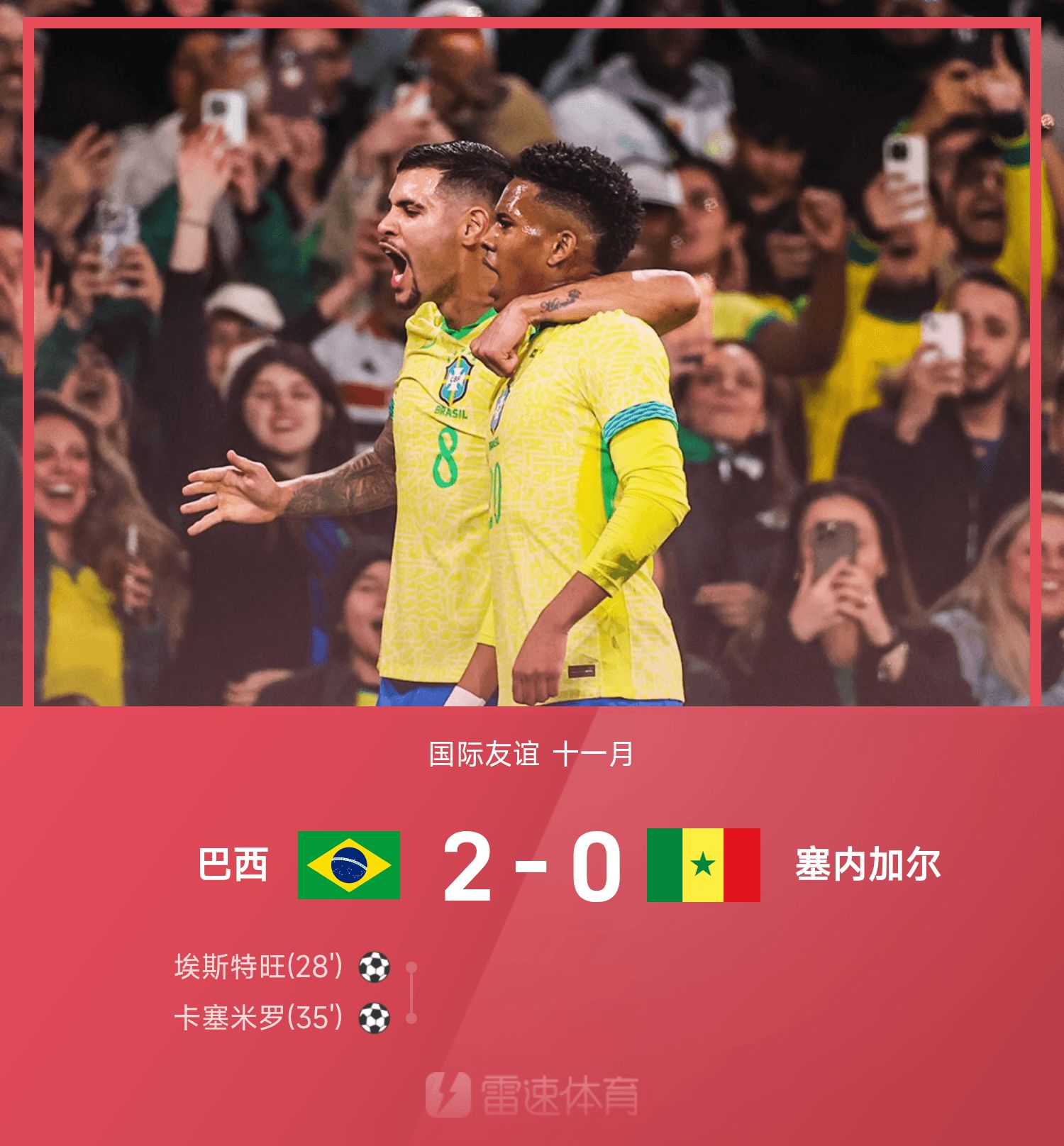 6686 Sports 16 พฤศจิกายน ในฤดูกาลที่ 25 ของมิตรภาพระหว่างประเทศในเดือนพฤศจิกายน บราซิลเอาชนะเซเนกัล 2-0 ในครึ่งแรกของเกม เอสเตบัน ยิงเข้าประตูอย่างแรงจากทางขวา และ คาเซมิโร่ ใช้ประโยชน์จากโอกาสที่ผิดของคู่ต่อสู้ในการทำประตู ในครึ่งหลังทั้งสองฝ่ายทำผลงานไม่ได้เลย และกาเบรียลก็ออกจากสนามด้วยอาการบาดเจ็บ