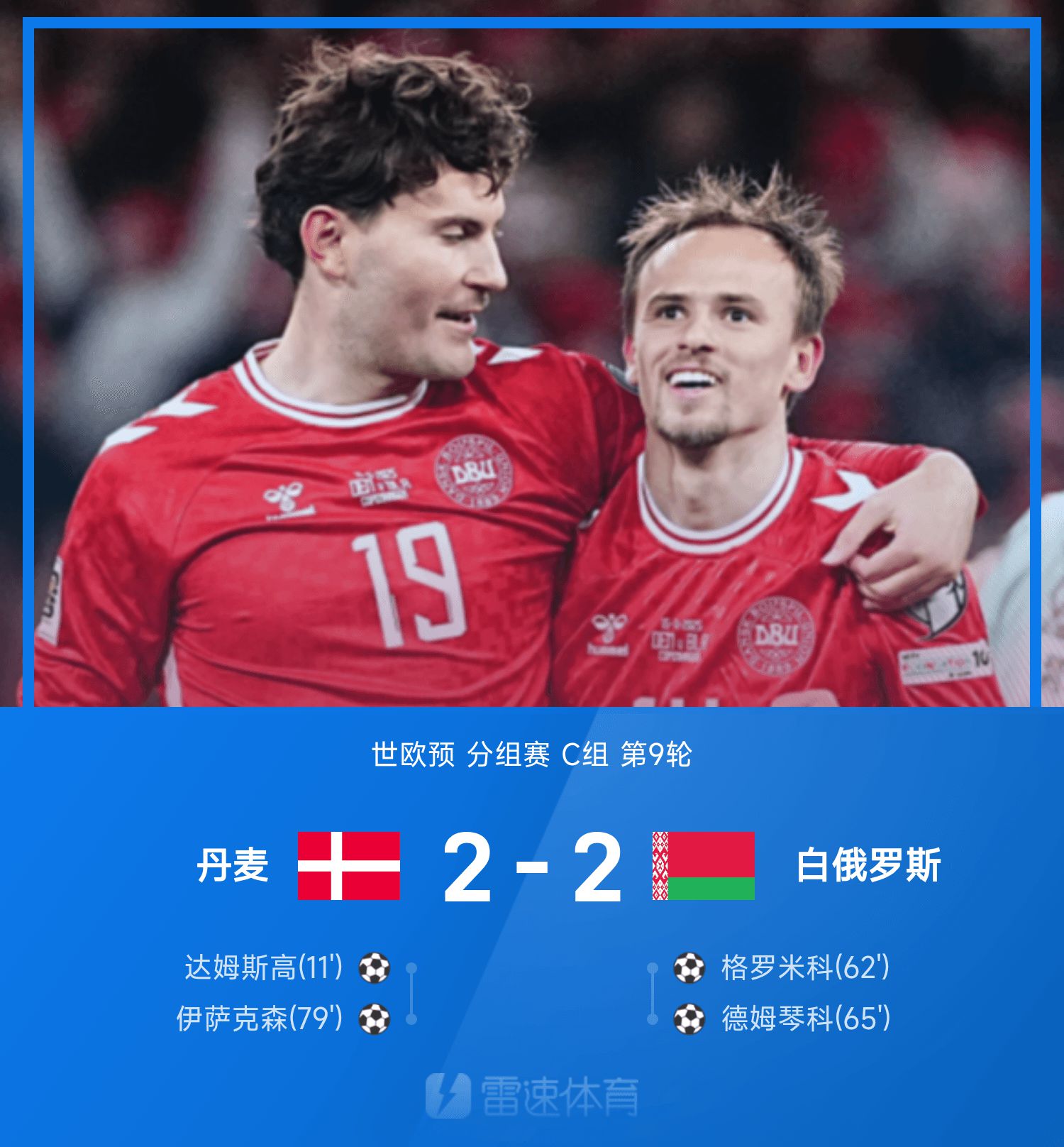 6686 Sports รายงานเมื่อวันที่ 16 พฤศจิกายนว่าในรอบที่ 9 ของกลุ่ม C ของรอบคัดเลือกโลกยุโรปครั้งที่ 26 เดนมาร์กเผชิญหน้ากับเบลารุส ในนาทีที่ 11 Damsko กระทบกับคลื่นซูเปอร์เวิลด์นอกโซนสามวินาที และเดนมาร์กก็เริ่มต้นความฝันได้ สถานการณ์พลิกผันกะทันหันในครึ่งหลัง เบลารุสใช้บอลของโกรมิโก้ยิงประตูในนาทีที่ 62 และ 65 และพลิกสกอร์เป็น 2-1 ทันที นาทีที่ 79 ดอร์กูจ่ายบอลเข้าเขตโทษไอแซคสันทำประตูได้ ทั้งสองทีมกลับมาที่เส้นสตาร์ทเดียวกันอีกครั้ง สุดท้ายเดนมาร์กเสมอเบลารุส 2-2 ในบ้าน เนื่องจากสกอตแลนด์ในกลุ่มเดียวกันแพ้กรีซในเกมเยือน เดนมาร์ก ยังคงครองตำแหน่งที่ได้เปรียบในการผ่านเข้าสู่รอบชิงชนะเลิศฟุตบอลโลกโดยตรง