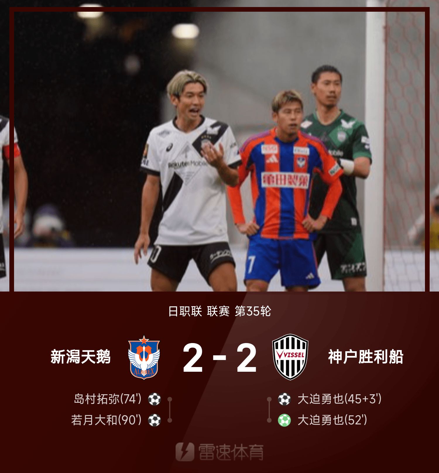รายงานการแข่งขันลีกอาชีพญี่ปุ่น ยามาโตะ วาคาซูกิ เป็นผู้กอบกู้ทีมสำรอง นีงาตะ เสมอ โคเบะ 2-2