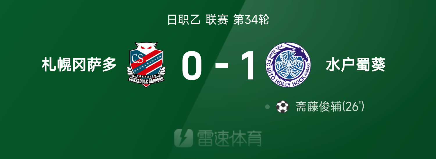 รายงานการแข่งขันลีกบีญี่ปุ่น ชุนสุเกะ ไซโตะ ชนะ คอนซาโดล ซัปโปโร 0-1 มิโตะ ฮอลลี่ฮ็อค