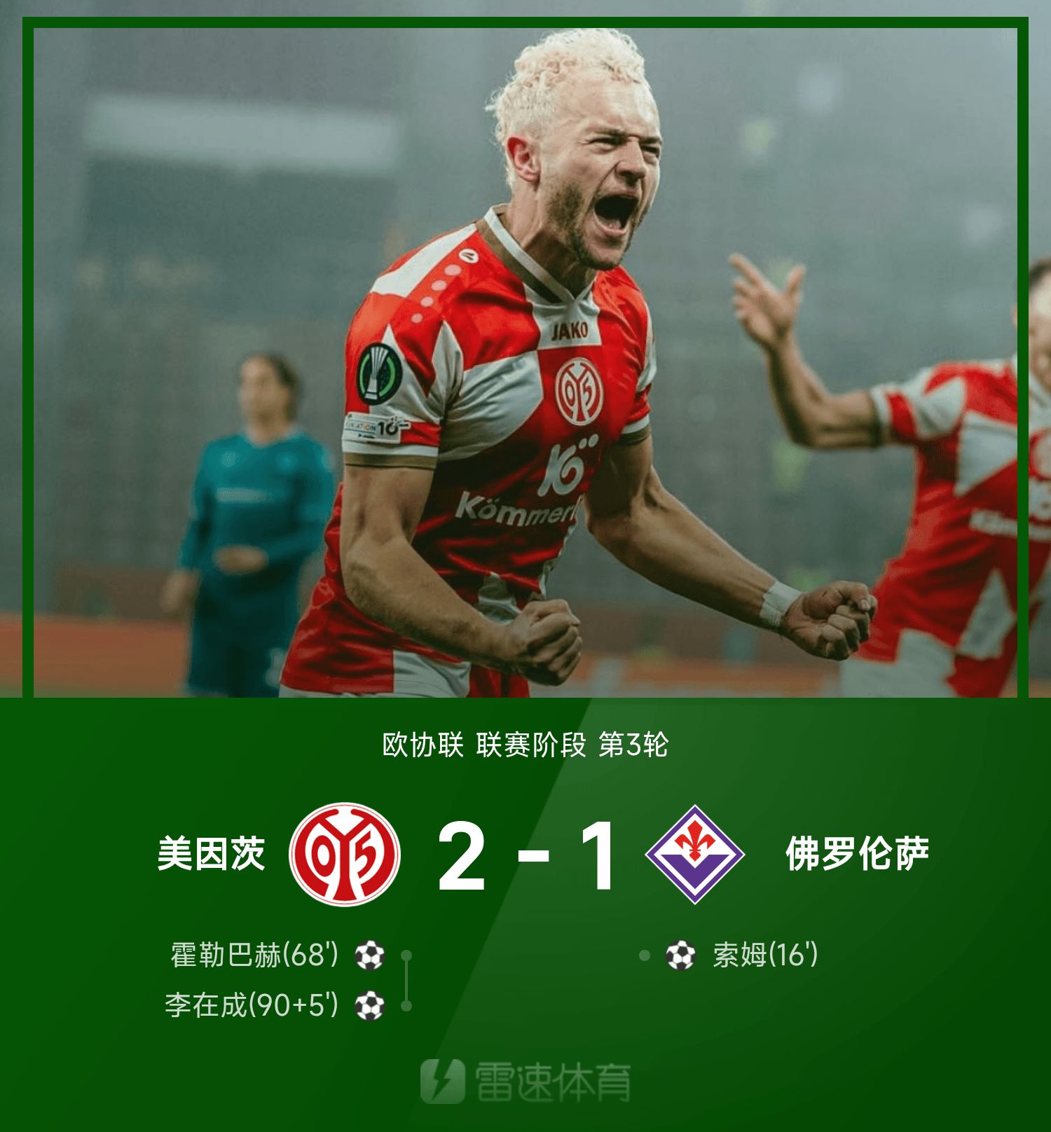 6686 ข่าวกีฬาวันที่ 7 พฤศจิกายน ในรอบที่สามของยูฟ่าแชมเปียนส์ลีก 25/26 ไมนซ์เอาชนะฟิออเรนติน่า 2-1 นาทีที่ 16 ครึ่งแรก ส้มทำประตูช่วยให้ ฟิออเรนติน่า เปิดสกอร์ได้ ในครึ่งหลังของเกม หลี่ ไจเฉิง ซึ่งลงเล่นเป็นตัวสำรอง ช่วยฮอลเลอร์บัคทำประตูตีเสมอ นอกจากนี้เขายังโหม่งบอลในช่วงทดเวลาบาดเจ็บนาทีสุดท้ายเพื่อยิงประตูสุดท้าย ช่วยให้ไมนซ์พลิกชัยชนะกลับมาได้