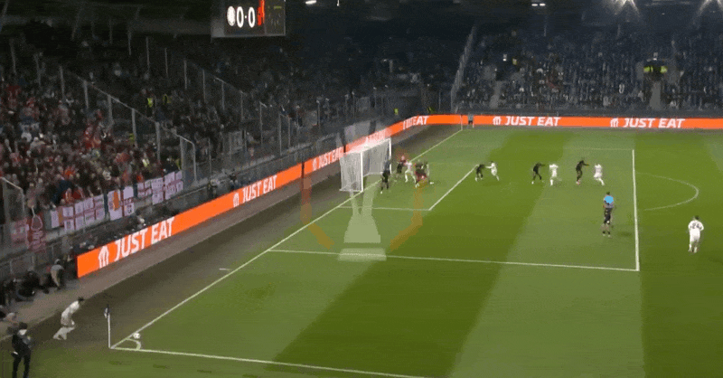 ทีมฟอเรสต์ขู่ว่าจะเตะลูกตั้งเตะในแดนหน้า และแม็กคาร์ตีก็พบบอล แล้วดันมุมไกลออกไปให้กว้างจากเสาเล็กน้อย